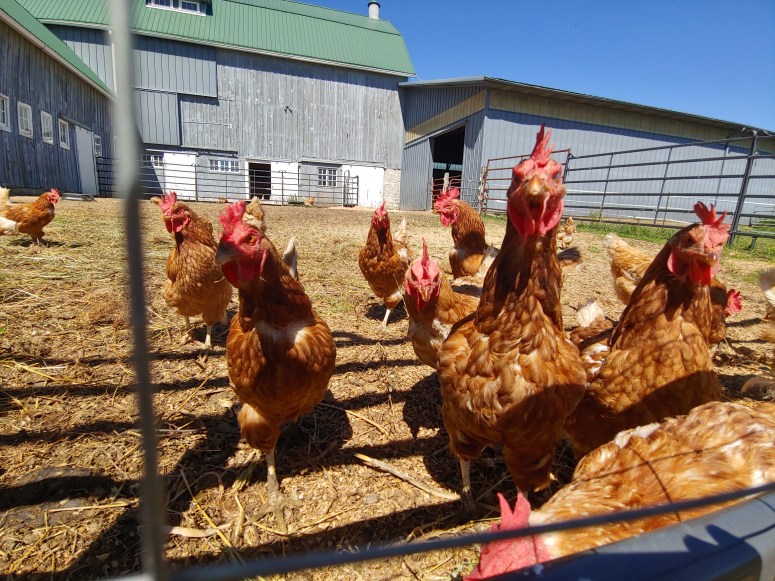 Our layer hens produce eggs and process community food scraps into compost for our plants.